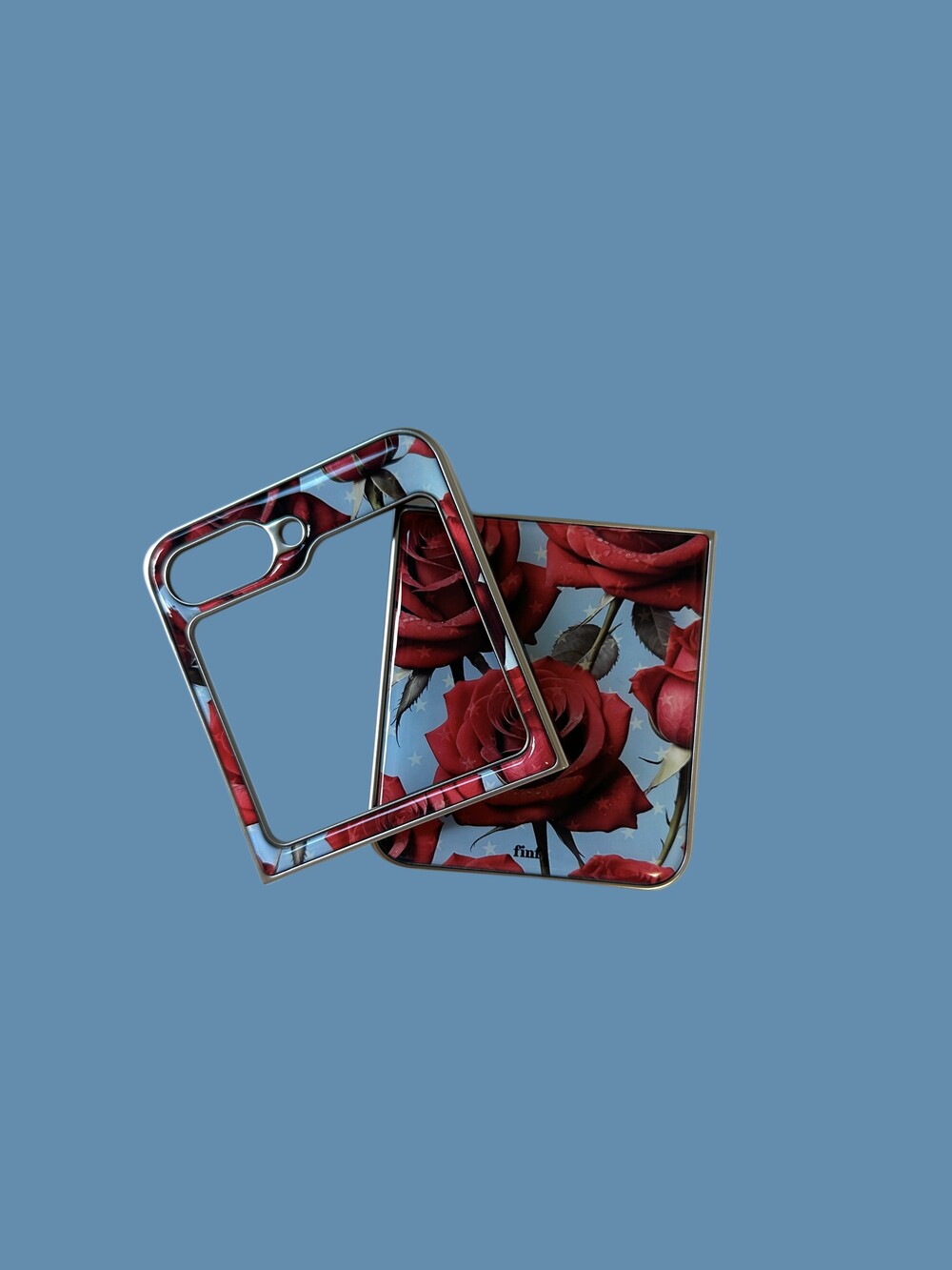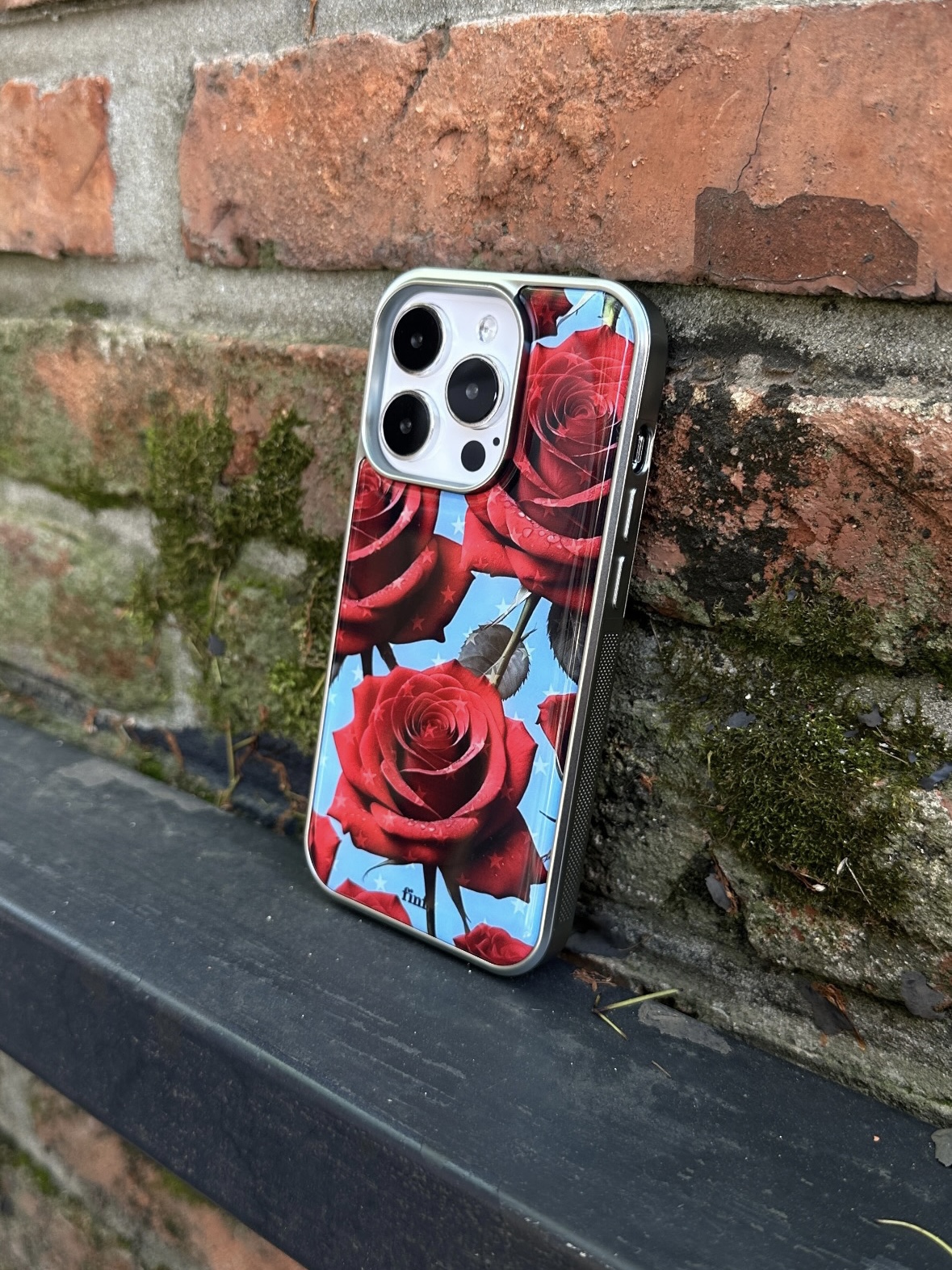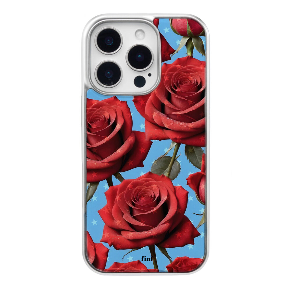 자칫 올드해 보일 수 있는 클래식한 레드 장미를, 쿨한 블루 베이스 위에 별 포인트를 더한 배경으로 감싸 하이틴 무드로 재해석한 케이스