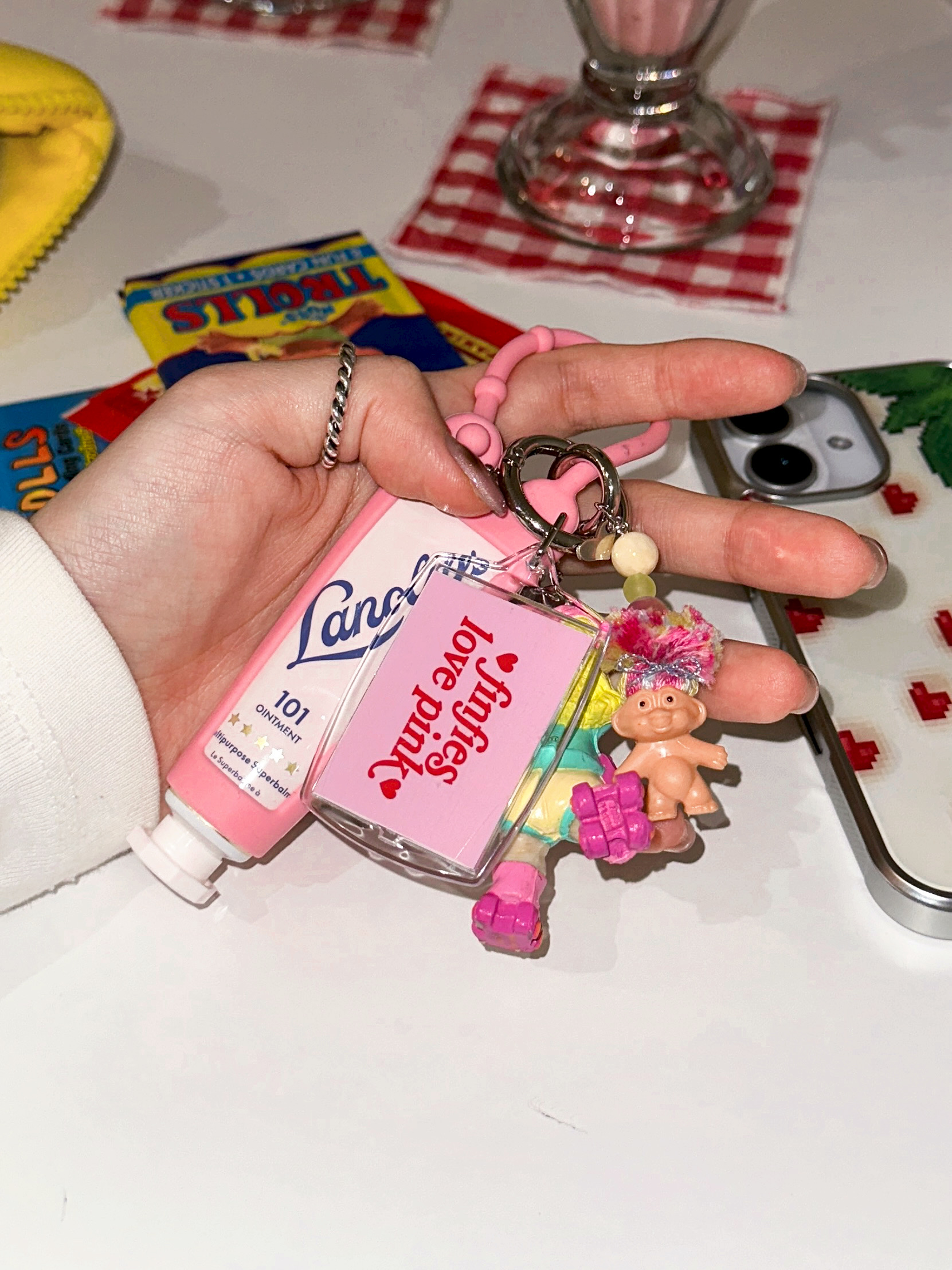 Luv Tag Keyring의 앞면에는 finfies love pink로 핑크 러브 무드를, 뒷면에는 I ♥ ff로 핀프 시그널을 담은 투사이드 디자인이라 가방에 툭 달기만 해도 포인트가 귀엽게 살아나요 🩷🎀